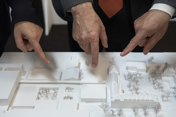 Le projet lauréat se compose d’une vaste esplanade en plan incliné, qui relie les différents niveaux dans la continuité, permettant une grande fluidité des parcours piétonniers. Elle est flanquée de deux patios qui dialoguent avec le jardin voisin et se prolonge à l’est par un volume émergent à la géométrie simple et basse. Véritable pivot entre les constructions historiques (Agrilogie) et celles plus récentes, le nouveau bâtiment délimite clairement les espaces extérieurs. Sa toiture d’inspiration brutaliste paraît à la fois compacte et flottante au-dessus des quatre façades transparentes, qui dégagent des perspectives à travers l’édifice.