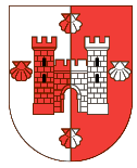 Parti d’argent et de gueules, au château accompagné en chef, aux flancset en pointe de quatre coquilles, le tout de l’un à l’autre.