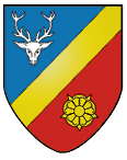Taillé au 1 d’azur au rencontre de cerf d’argent; au 2 de gueules à la rose d’or une barre du même brochant sur la partition