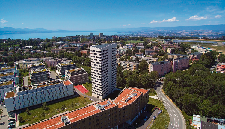 Parmi les bâtiments qui dessinent le nouveau quartier du Bugnon, figure entre autres une tour de plus de 65 m de haut composée d’appartements proposés à la location et déclinés de 2,5 à 4,5 pièces. Une particularité vient du fait que c’est la seule et unique nouvelle tour construite au XXIe siècle dans l’agglomération lausannoise et qu’elle n’a fait l’objet d’aucune opposition. Ce projet se distingue également par ses lignes épurées et son architecture résolument contemporaine. Composée de 18 étages, elle développe des façades aux baies vitrées qui s’ouvrent sur l’horizon à 360° et jouissent d’un magnifique dégagement tant sur la ville de Lausanne, le lac et le Jura. Sa faible empreinte au sol ainsi que son parking enterré lui permettent de dégager un magnifique parc arborisé au cœur du quartier destiné aux résidents, promeneurs et à vocation de détente et place de jeux.