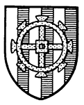 Palé d’argent et d’azur à la roue de moulin d’or brochante.