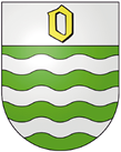 De sinople à trois fasces ondées d’argent, au chef du même chargé d’une lettre O gothique d’or.