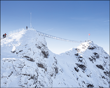 Le Peak Walk, pont suspendu unique au monde qui relie deux sommets à Glacier 3000, offre une vue imprenable sur les montagnes mythiques telles que le Cervin, le Mont Blanc ou la Jungfrau.