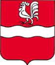 De gueules à la fasce ondée d’argent, accompagnée en chef d’un coq du même.