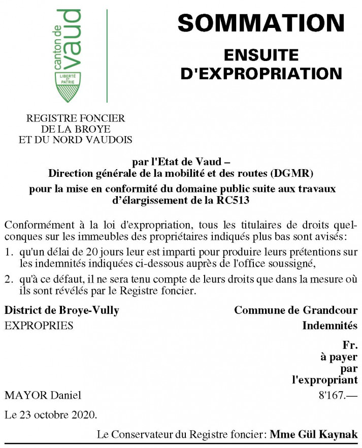 L’inscription au Registre Foncier, sera requise conformément aux dispositions des articles 87 à 89 du Code du 12.01.2010 de droit privé judiciaire vaudois (CDPJ, RSV 211.02).