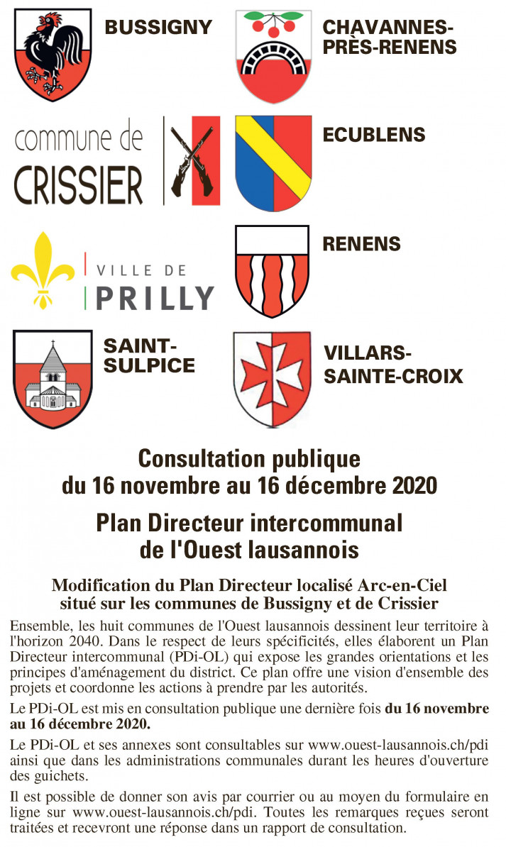Conformément aux dispositions de l’ordonnance relative à l’étude de l’impact sur l’environnement (art. 20 OEIE) et du règlement d’application de l’Ordonnance fédérale relative à l’étude d’impact sur l’environnement (art. 15 RVOEIE), la Municipalité de Crissier soumet à la consultation publique du 24 juin au 23 juillet 202019.06.2020 / FAO n° 49